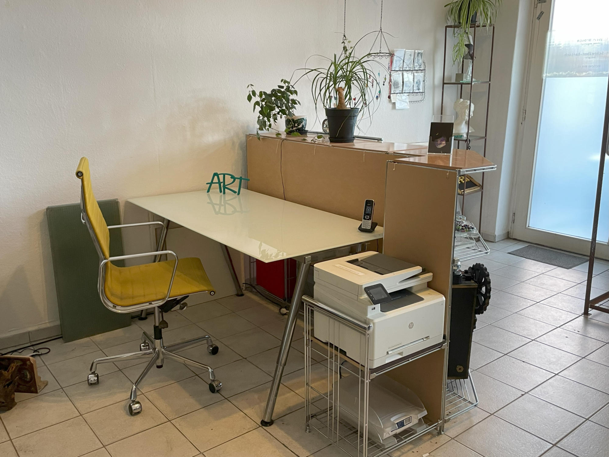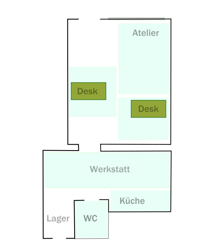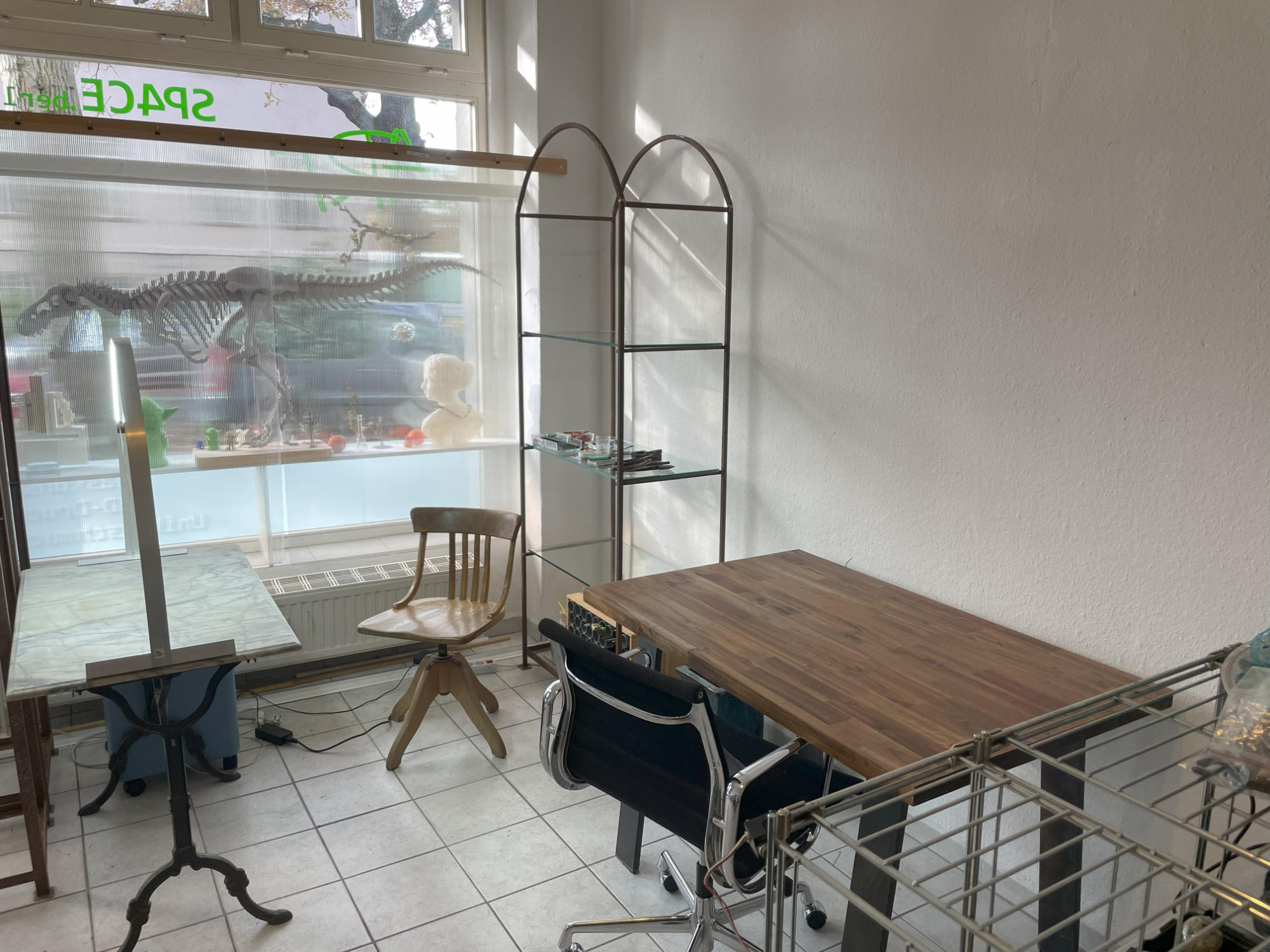 Derzeit teilen sich diesen inspirierenden Raum eine Glas-Künstlerin (Marit) und ein 3D-Designer (Oliver). Der vordere Bereich bietet eine lichtdurchflutete Atelier-Fläche sowie einen Schreibtisch-Arbeitsplatz. Im hinteren Raum befindet sich ein weiterer Arbeitsplatz, eine Werkstatt mit 3-D-Druckern, eine Kaffee/Tee-Küche und ein WC.
